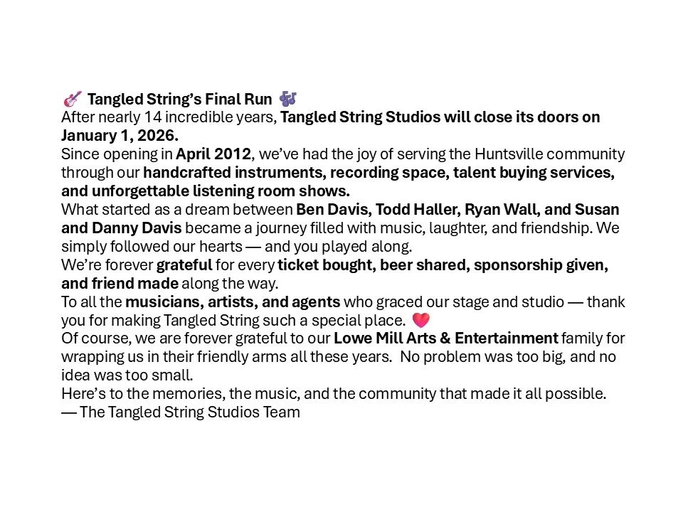 THE VENUE AT tangled string studios offers an intimate and acoustically pleasing Concert EXPERIENCE. Capacity is 120 seats.